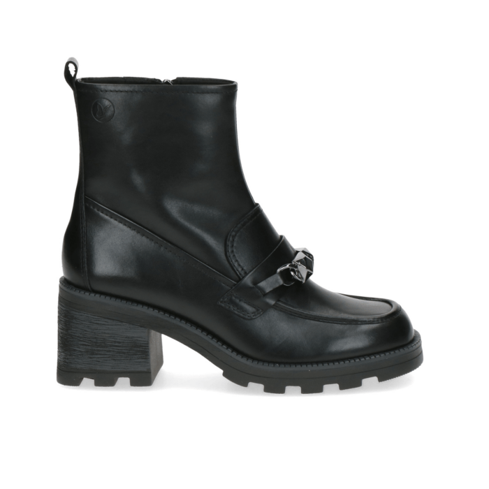 Die Caprice Stiefelette in schwarz mit Blockabsatz und dekorativer Kette besticht durhc die neue Karree-Form. Die neuartige Schuspitze steht nicht nur für den neuen Trend, sondern überezugt beim Tragen durch ihre Bequemlichkeit. Die Zehen sind nicht mehr eingeent, sondern haben genügend Freiraum und Platz. Richtig cool wirkt dieser neue Style mit dgrob gestricketen Socken. Oder aber mit blickdichten Perlonstrüpfen, am besten in wilden, auffälligen Mustern und dazu ein kleines Schwarzes.
